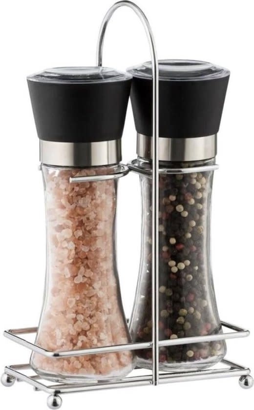 Breng stijl en gemak naar de eettafel met deze peper- en zoutmolen set van glas. De set bestaat uit twee gevulde molens van elk 12 cm hoog, geplaatst in een elegante houder. Zo heb je altijd peper en zout binnen handbereik, netjes gepresenteerd op tafel of in de keuken.