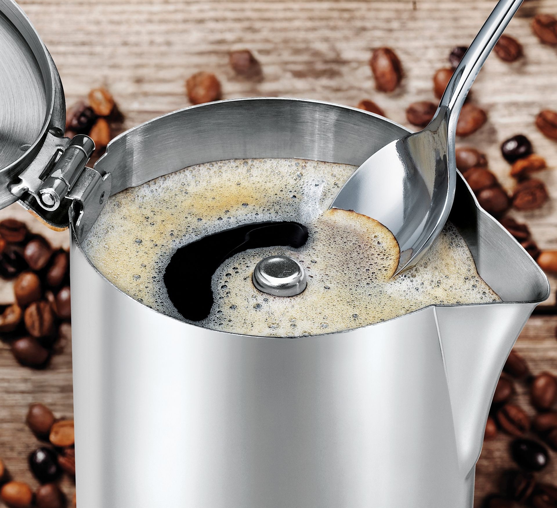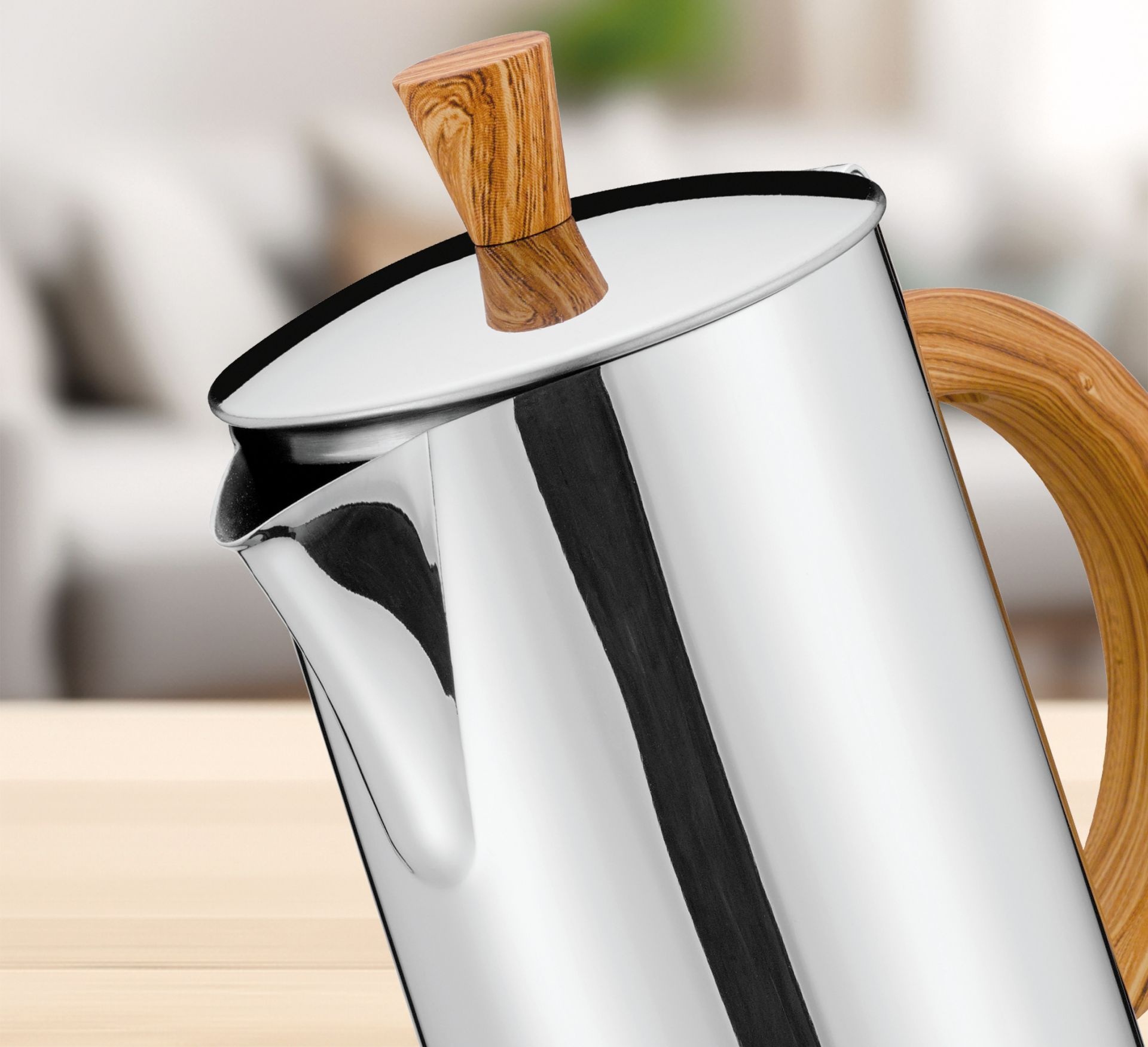 De behuizing is gemaakt van gepolijst roestvrij staal, wat niet alleen duurzaam is, maar ook een stijlvolle uitstraling geeft. De handgreep en de knop op het deksel zijn voorzien van een warme olijfhoutlook en blijven koel tijdens het gebruik.