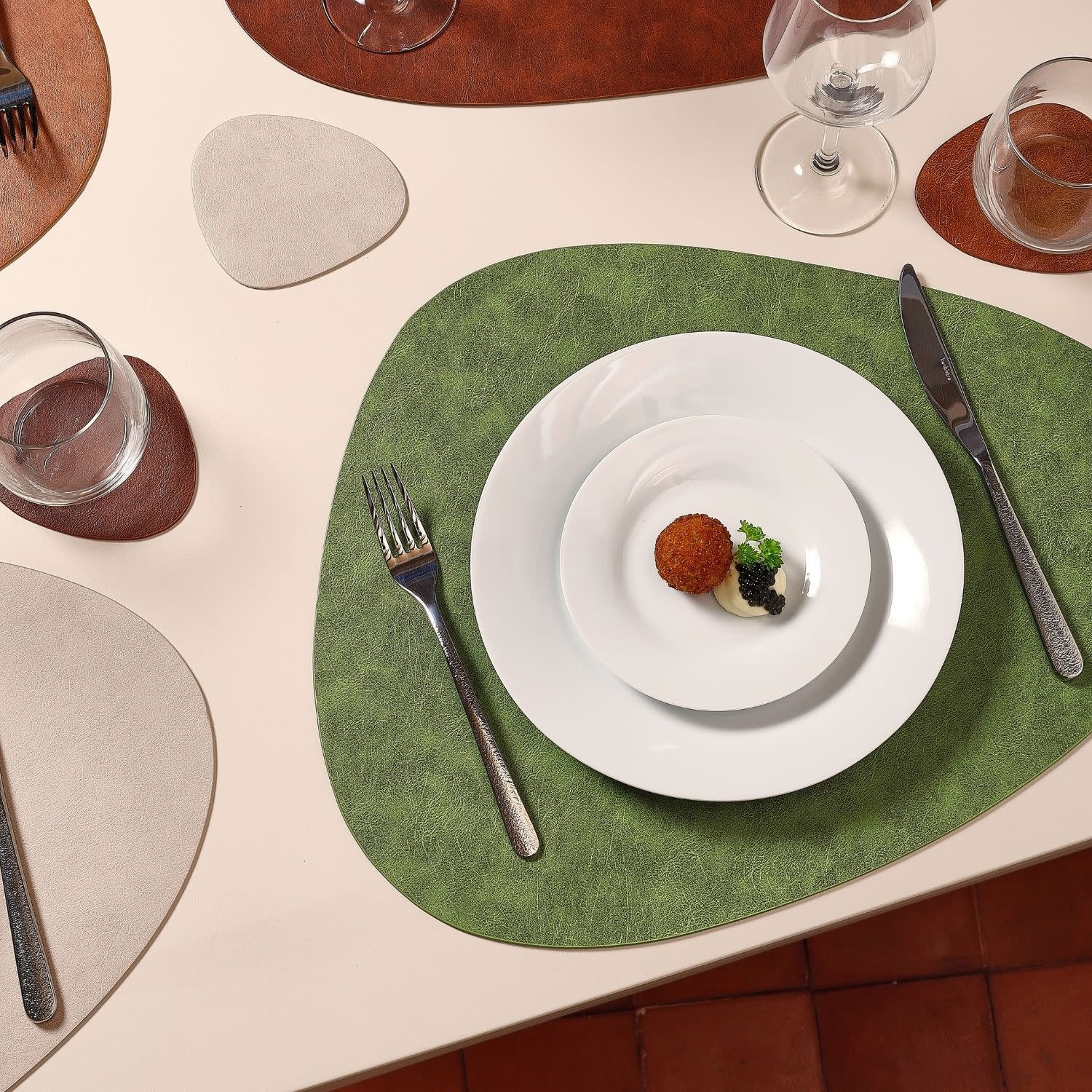 De placemat uit de Layer-collectie van BonBistro heeft een afmeting van 45 x 37 cm en is uitgevoerd in groen. Het eivormige model is gemaakt van hoogwaardig kunstleder, waardoor het stevig en gemakkelijk schoon te maken is.