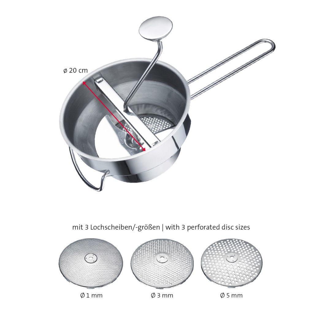 Met zijn 3 gemakkelijk vervangbare geperforeerde schijven is deze zeef geschikt voor het snel en eenvoudig zeven, pureren en uitpersen van groenten en fruit en is hij ook ideaal voor het bereiden van babyvoeding. De grote steunpal zorgt voor een goede grip op potten van verschillende afmetingen. De Finoletta wordt eenvoudig uit elkaar gehaald om schoon te maken. Vaatwasmachinebestendig.