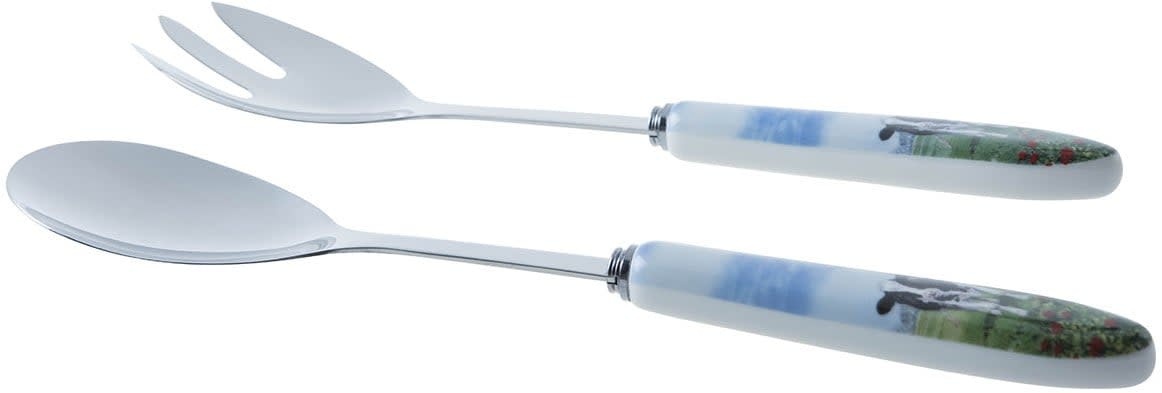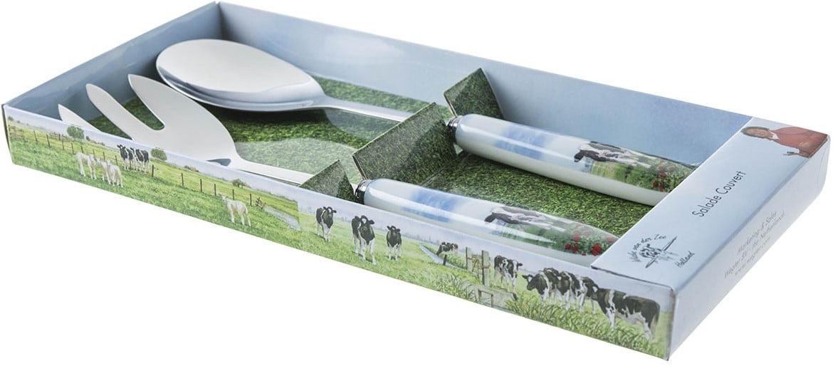 Brengt u graag een vleugje Hollandse charme op tafel? Met dit vrolijke salade couvert uit de collectie van Wiebe van der Zee geeft u elke maaltijd een landelijke en sfeervolle uitstraling. De handvatten zijn voorzien van een typisch Nederlands tafereel: grazende koeien in een weidelandschap, die direct een glimlach oproepen.