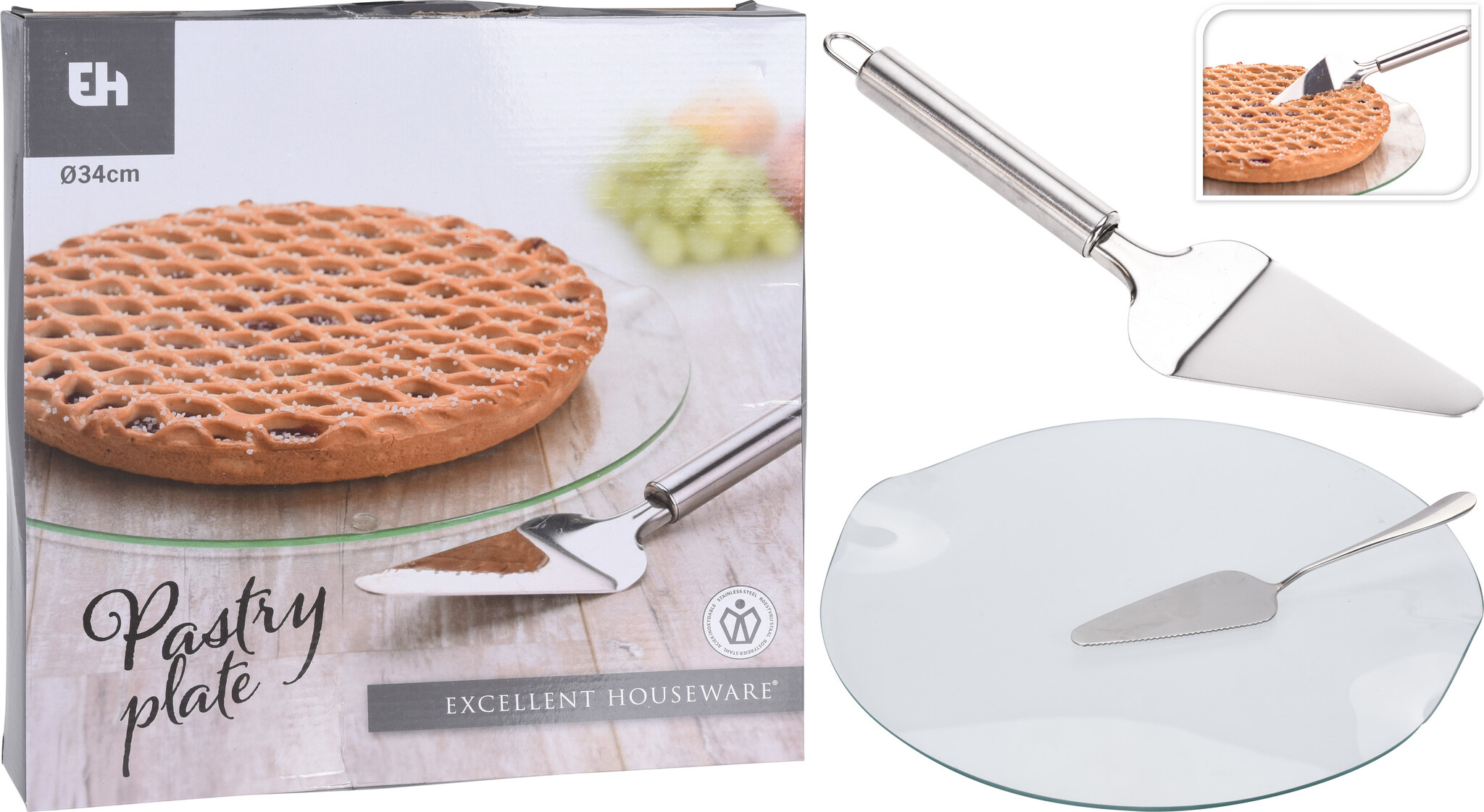 De glazen schaal heeft een diameter van Ø34cm. De schaal word geleverd met een taartschep met een kartelrandje, hierdoor kunt u gemakkelijk de taart snijden met de taartschep.