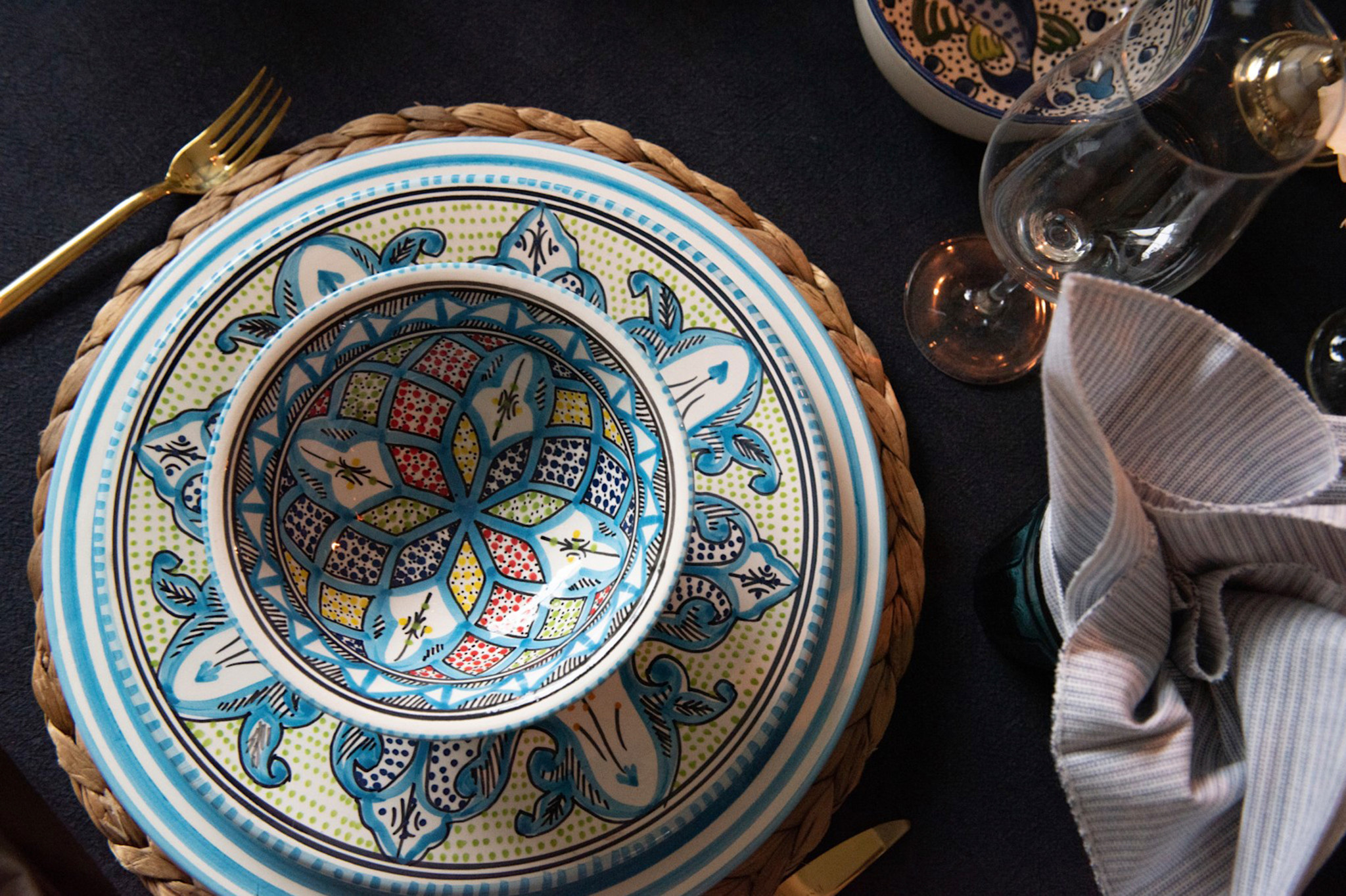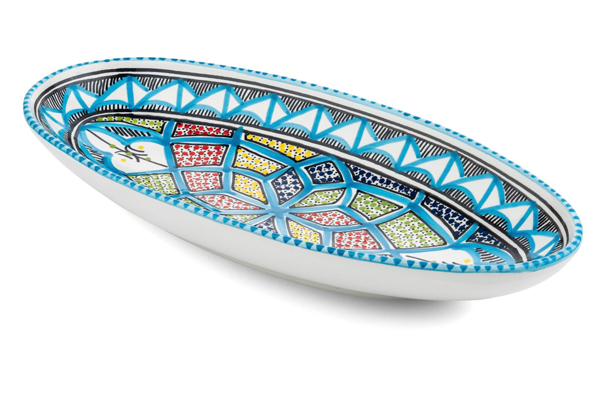 Een ovale schaal van Dishes and Deco in de kleur Turquoise Blue. De schaal is uitgevoerd in aardewerk en voorzien van een kleurrijke print met tinten blauw, geel, groen en rood, wat zorgt voor een decoratieve uitstraling met een subtiel oosters karakter.