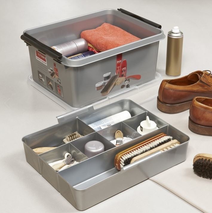 Deze box wordt geleverd met inzet waar je bijvoorbeeld veters, schoenlepels en kleine sponsjes in kan bewaren. In het onderste gedeelte van de box bewaar je de potjes schoenpoets, spuitbussen, poetsdoeken en -borstels.