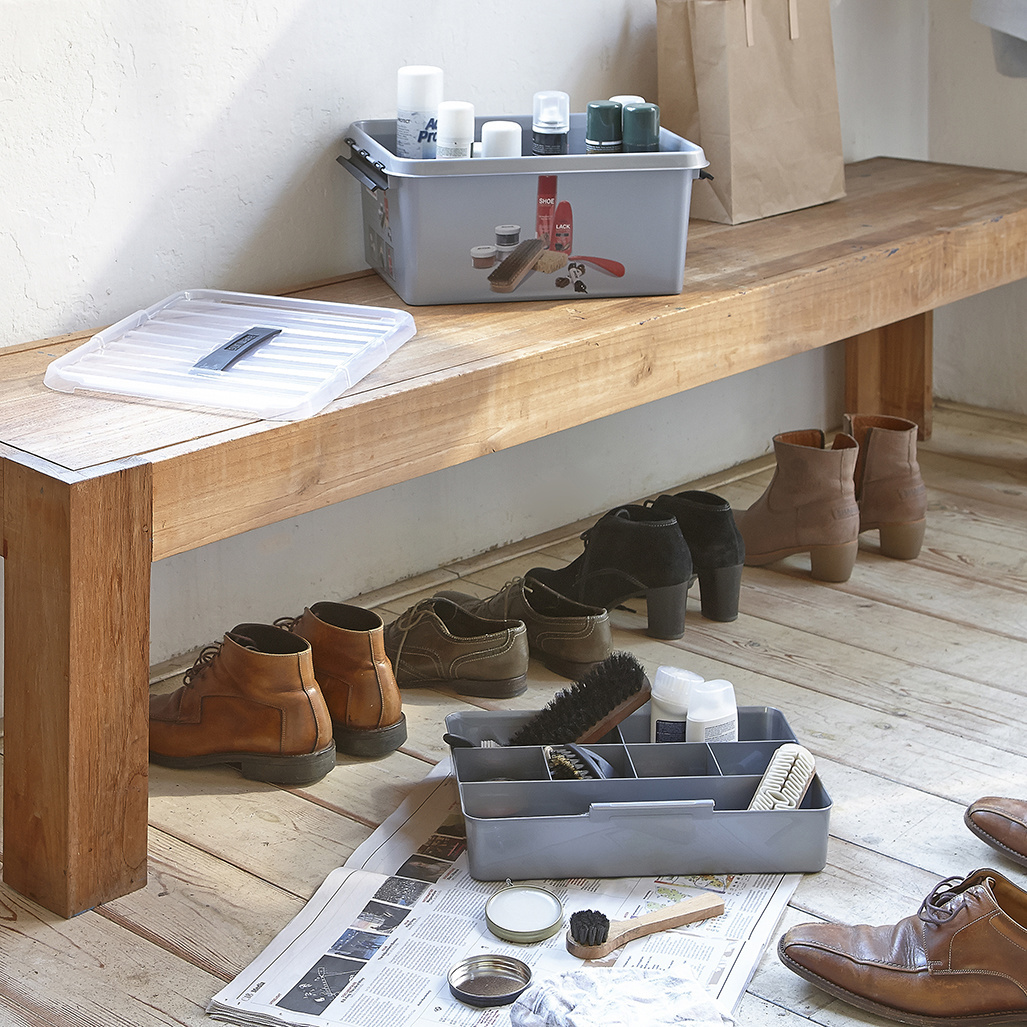Deze Q-line opbergbox is ontworpen om schoenen en bijbehorende accessoires georganiseerd te houden. De box heeft een uitneembare inzet met vakverdeling, ideaal voor het bewaren van kleinere items zoals schoenpoetsmiddelen en veters, terwijl er voldoende ruimte blijft voor grotere voorwerpen zoals inlegzolen en borstels.