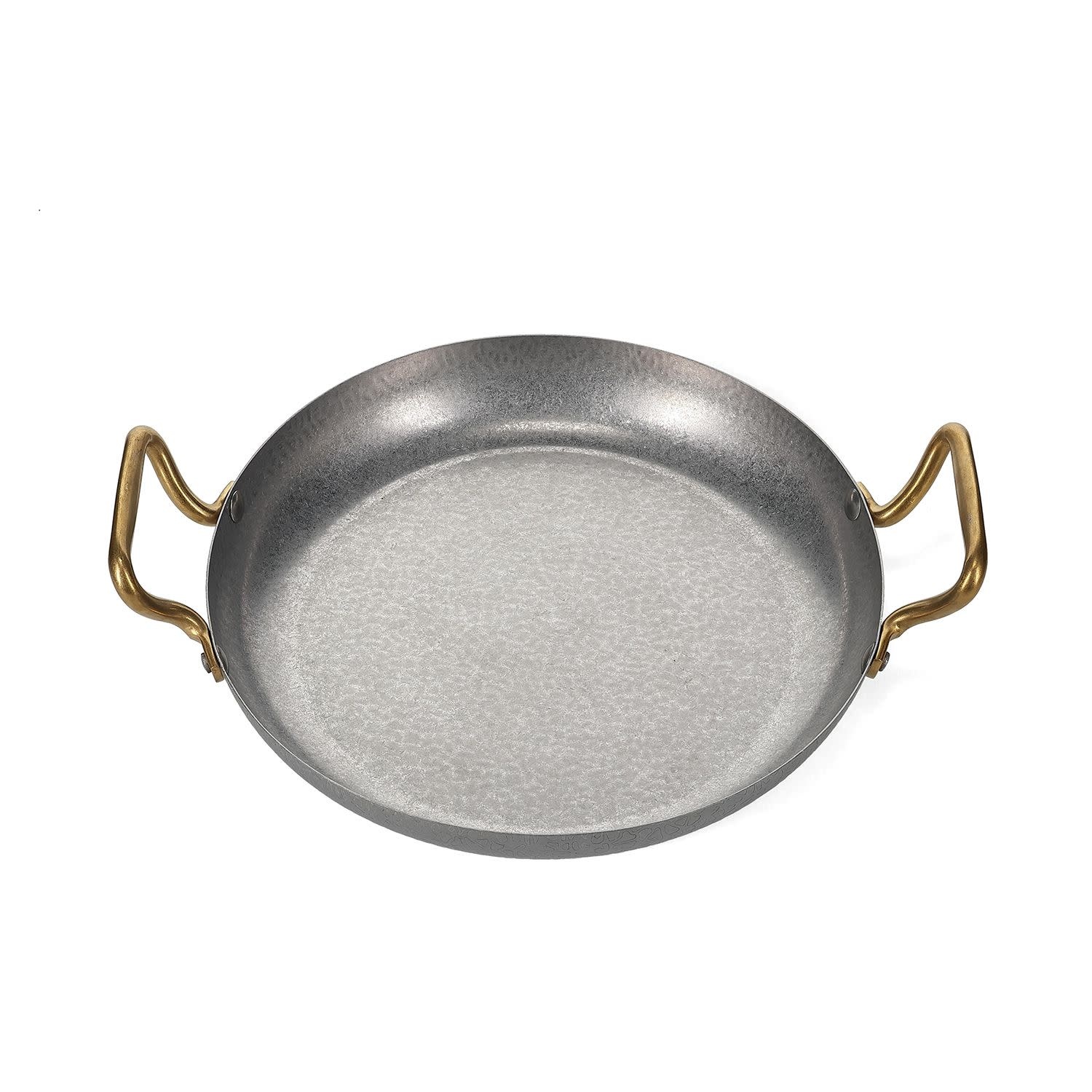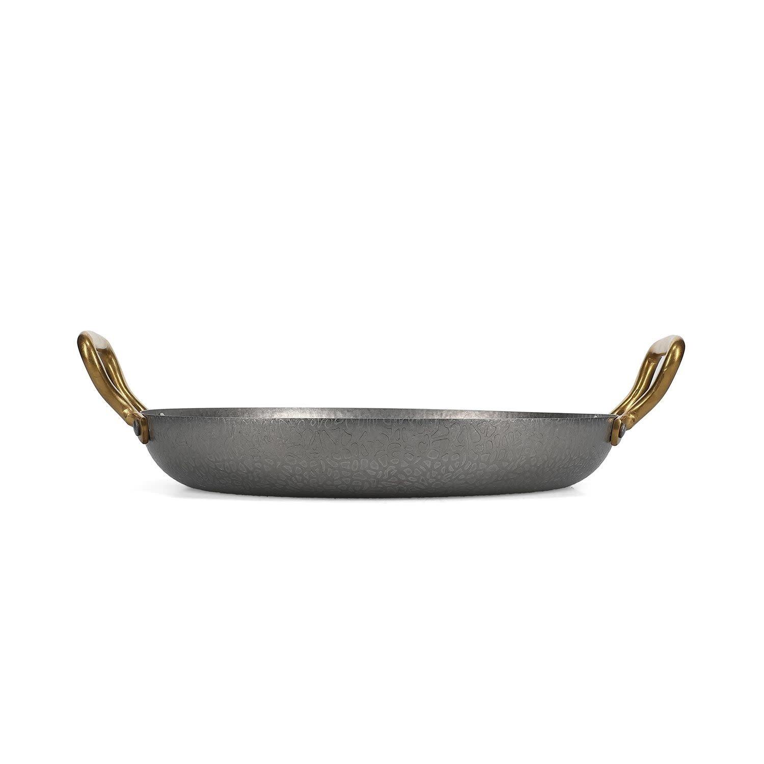 Presenteer uw gerechten met klasse met deze stijlvolle, ronde serveerschaal uit de Serve-collectie van BonBistro. De schaal, met een diameter van 28 cm en een hoogte van 5 cm, is vervaardigd uit hoogwaardig roestvrij staal en voorzien van een prachtige gehamerde afwerking in zilver met elegante gouden handvatten. Perfect voor het serveren van hapjes, desserts of bijgerechten, zowel thuis als in professionele horecaomgevingen.