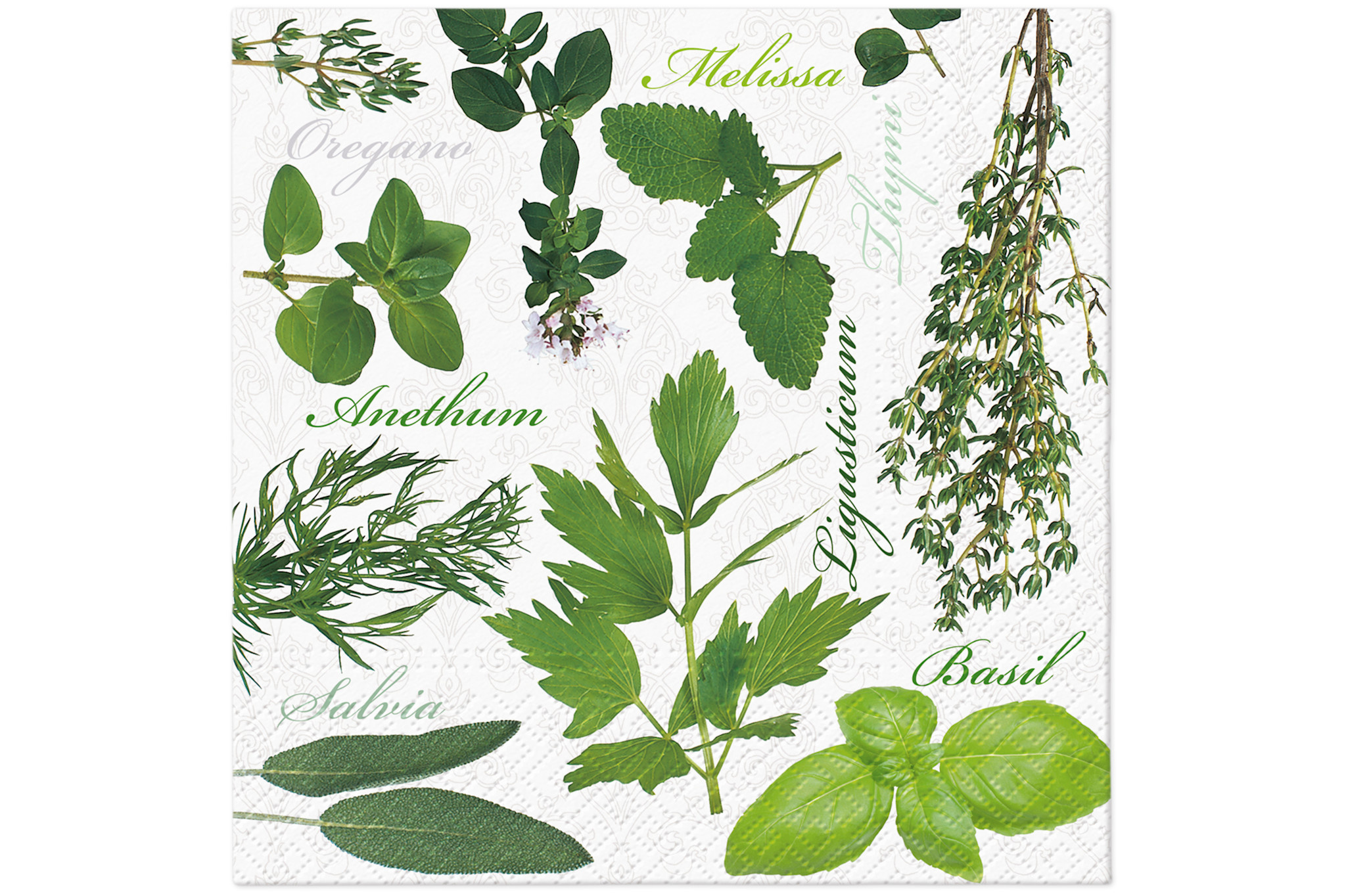 Deze set van 20 papieren servetten van 33 x 33 cm heeft een frisse en natuurlijke uitstraling. De servetten hebben een witte achtergrond met daarop verschillende kruiden afgebeeld, zoals oregano, basilicum en tijm. Bij elk kruid staat de naam in het Engels, schuin gedrukt, wat zorgt voor een speels en stijlvol detail.