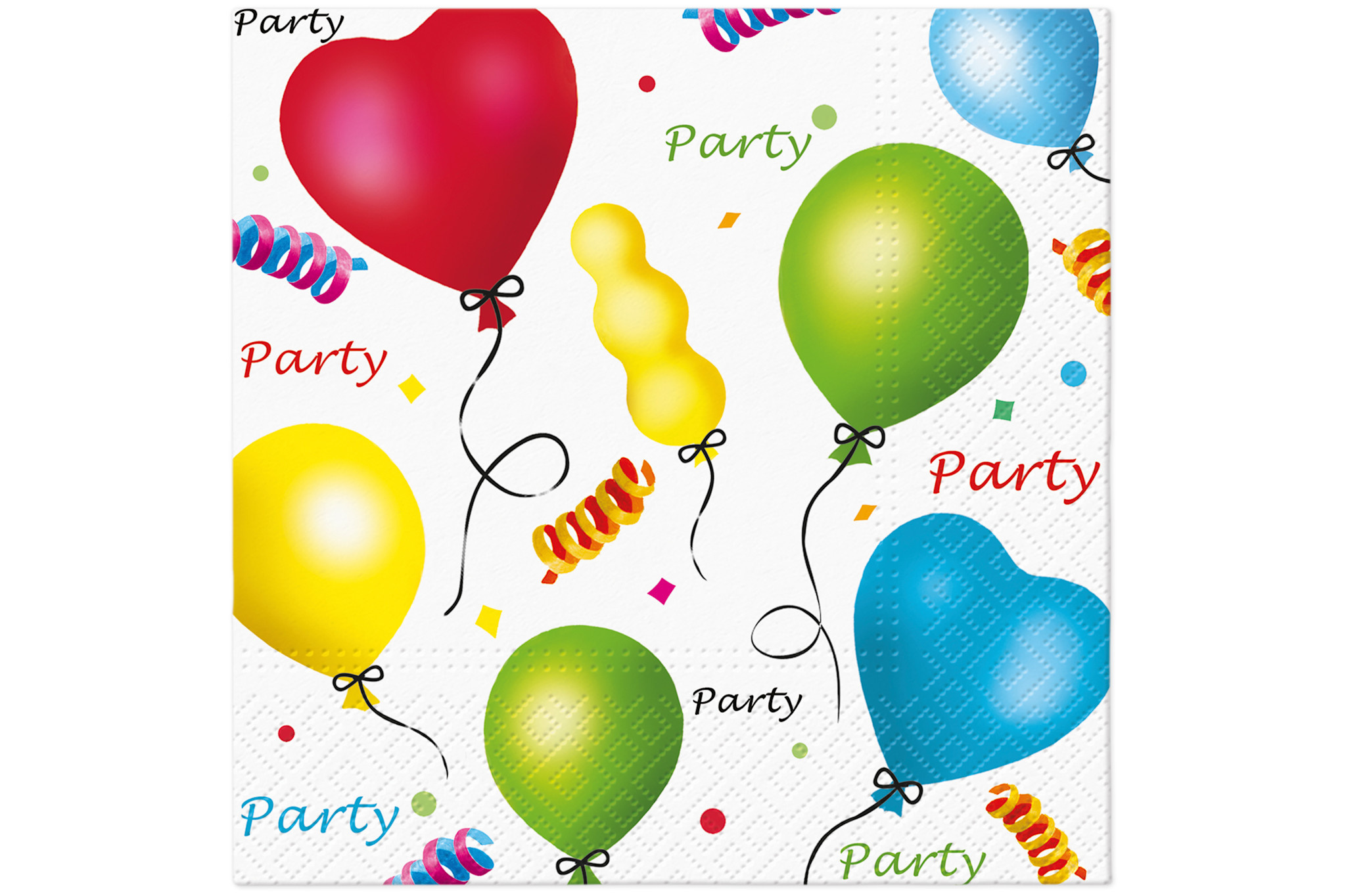 Deze set bestaat uit 20 papieren servetten van 33 x 33 cm en is ideaal voor feestelijke momenten. De servetten hebben een witte achtergrond met een vrolijke print van gekleurde ballonnen in rood, geel, groen en blauw. Ook staan er slingers en het woord 'Party' op, wat meteen zorgt voor een feestelijke sfeer.