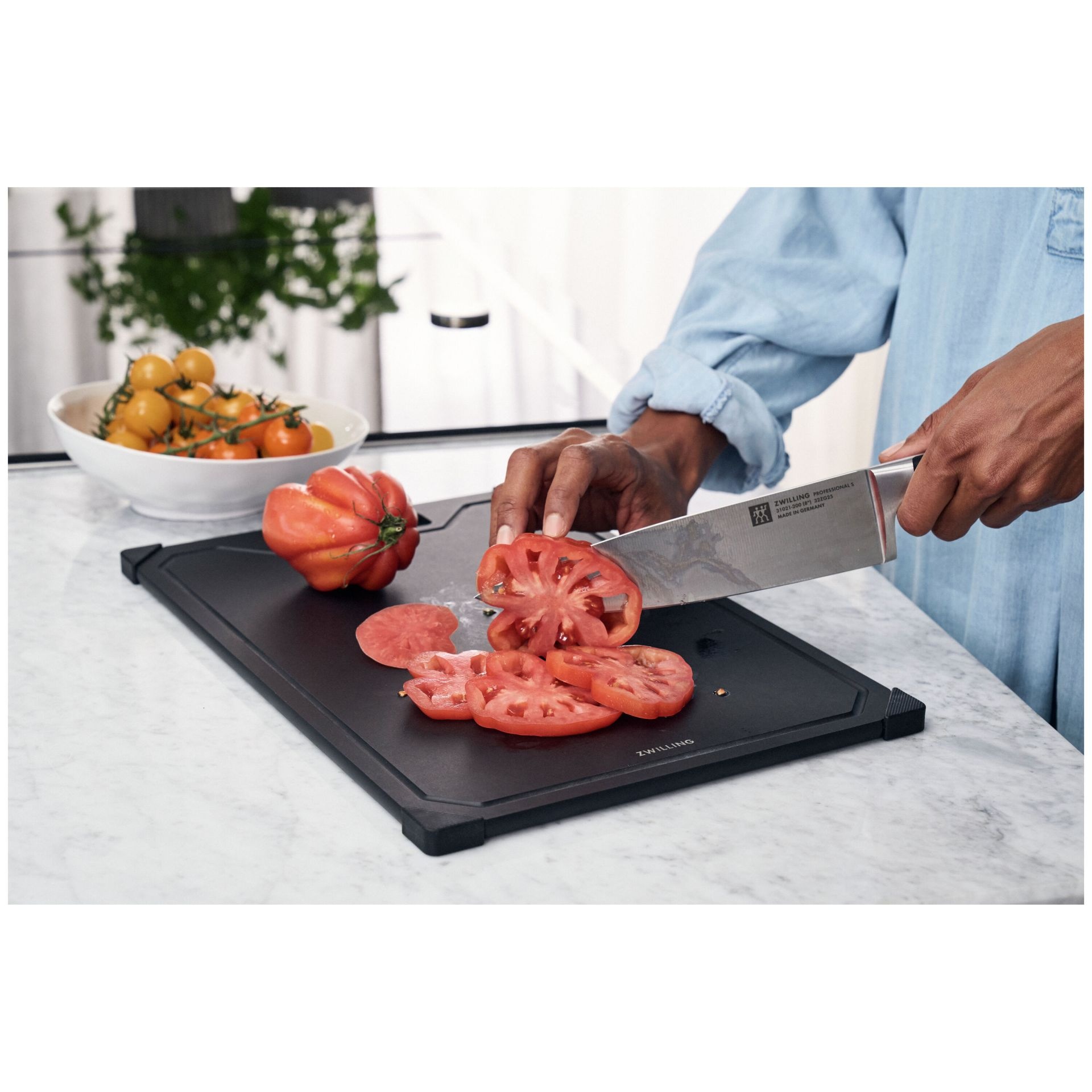 Breng stijl en functionaliteit samen in uw keuken met deze royale snijplank van Zwilling. Dankzij het moderne ontwerp in zwart houtlaminaat en de ruime afmetingen is deze plank bij uitstek geschikt voor grotere snijklussen en het bereiden van meerdere ingrediënten tegelijk.