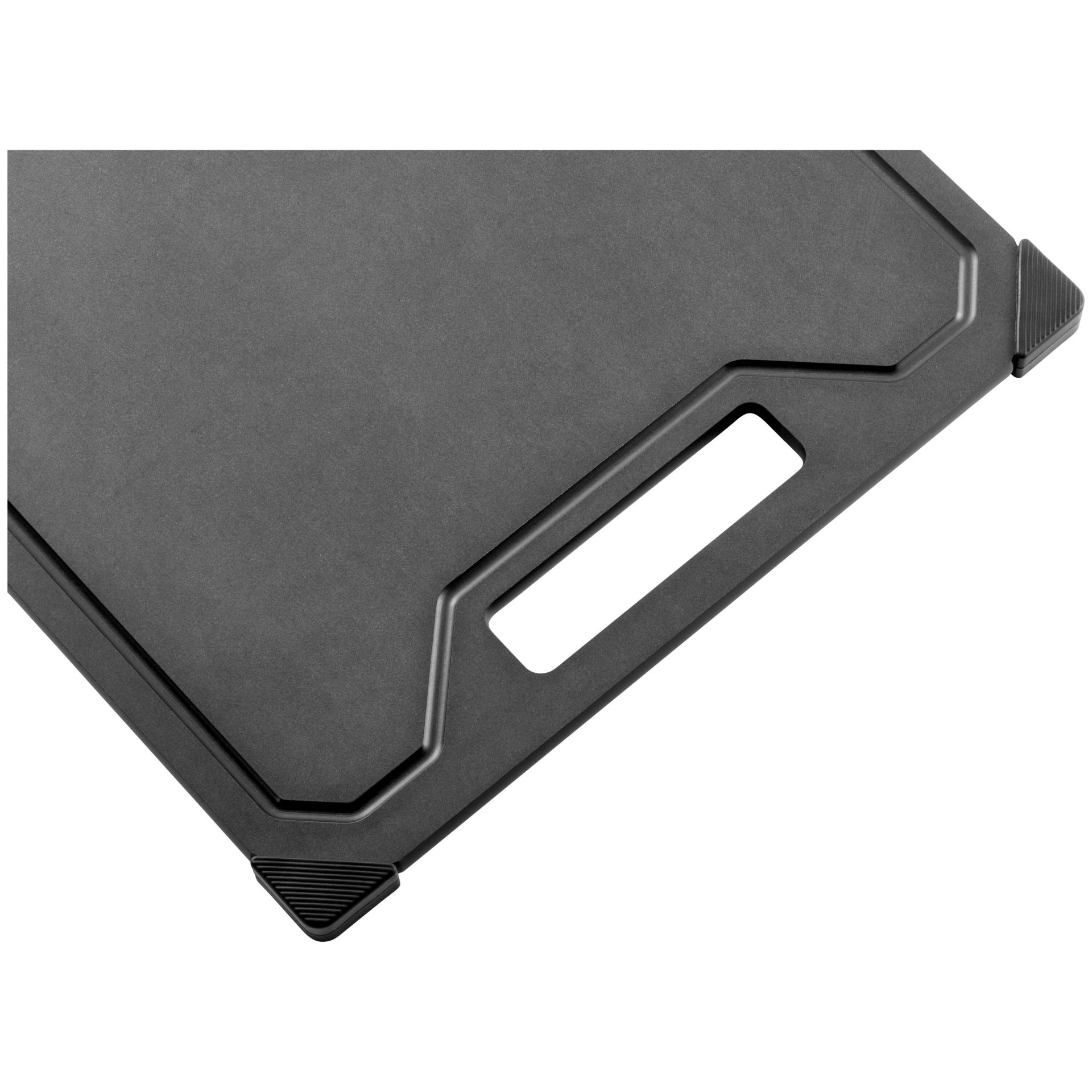 Het extra dunne profiel van slechts 1 cm maakt de plank verrassend licht en makkelijk op te bergen, zonder in te leveren op stevigheid. U kunt beide zijden gebruiken: één met een geïntegreerde saprand die morsen voorkomt en één gladde zijde voor algemeen snijwerk. Het vezelhouten oppervlak is zacht voor uw messen en draagt bij aan het behoud van hun scherpte.