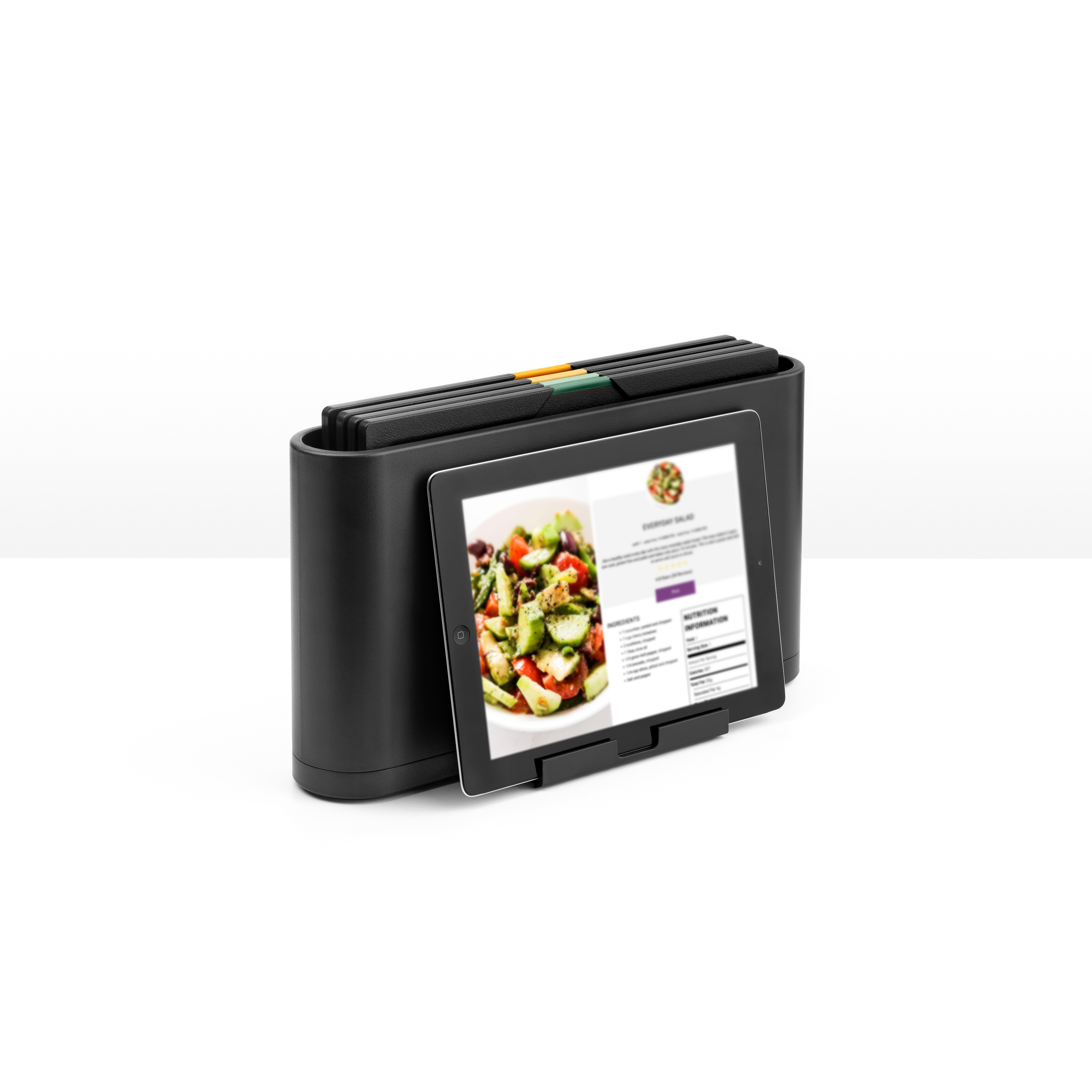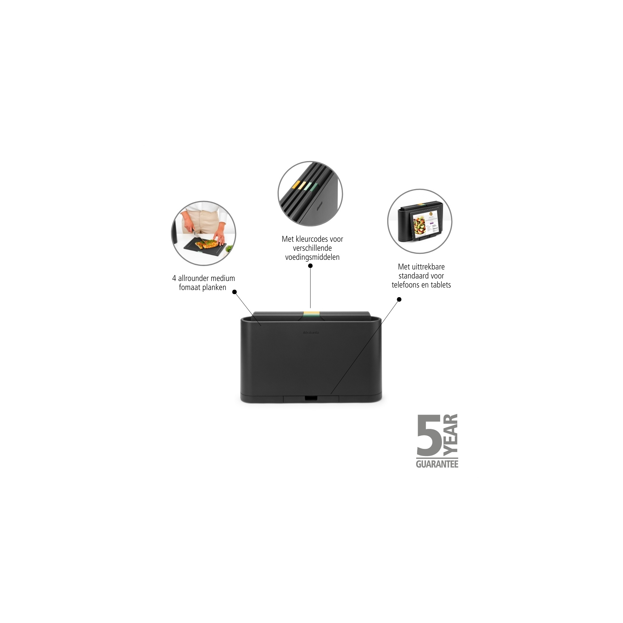 Met deze 4-delige Brabantia Tasty+ snijplankenset met houder van Brabantia heeft u alles binnen handbereik om hygiënisch, efficiënt en geordend te werken in uw keuken. Elke snijplank heeft een eigen kleurcode voor een specifiek soort voedingsmiddel (zoals groenten, brood, vlees en vis), ideaal om kruisbesmetting te voorkomen. De houder houdt uw planken netjes opgeborgen en beschikt bovendien over een uitschuifbare standaard voor uw tablet of kookboek, zodat u recepten gemakkelijk kunt volgen terwijl u kookt.