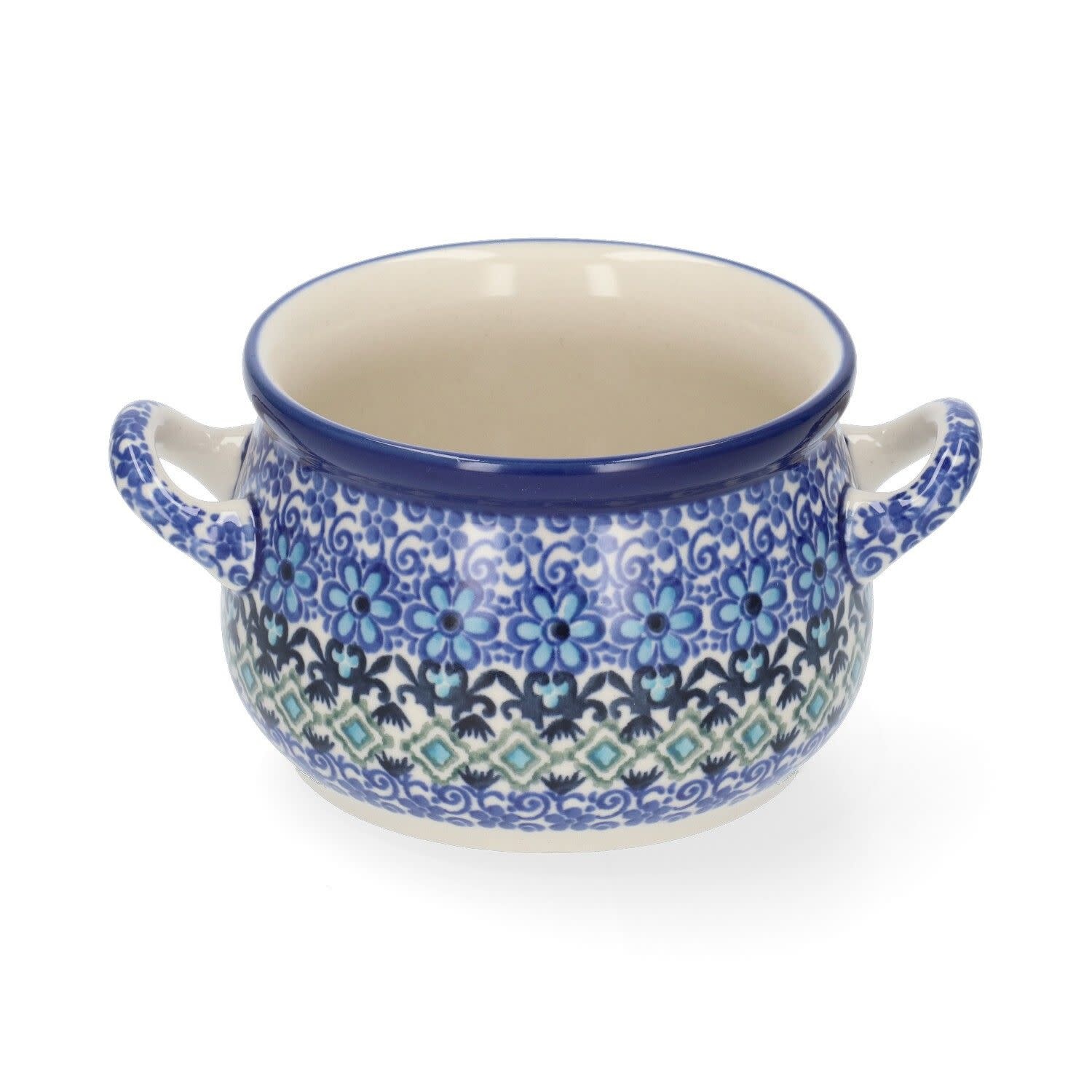 Deze soepkop Lisboa van het merk Bunzlau Castle heeft een koningsblauwe bloemenzee in een krans van bloesems. Het decor is handmatig aangebracht.