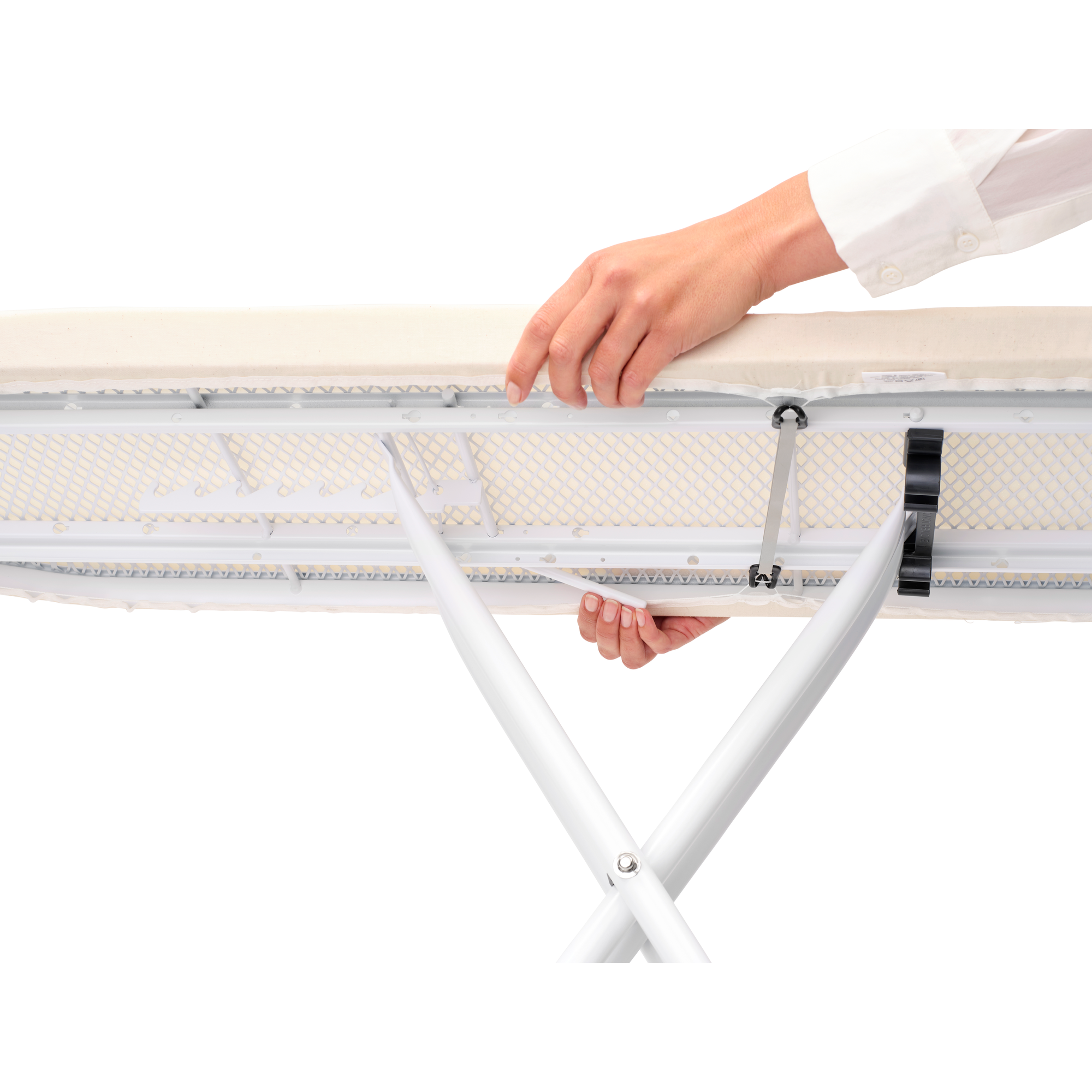 De overtrek van 100% Fairtrade katoen met veerkrachtige schuimlaag zorgt voor een soepel strijkoppervlak. Niet alleen goed voor je kleding, maar ook een bewuste en duurzame keuze. De plank is veilig in gebruik dankzij het kinderslot en makkelijk op te bergen dankzij de transportvergrendeling.
