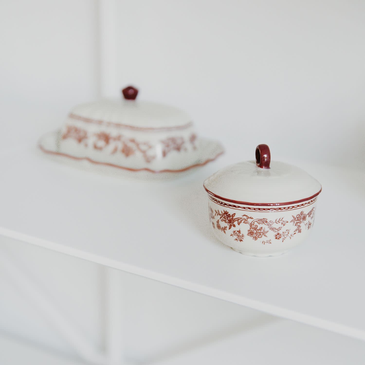 De suikerpot met deksel uit de Cyril collectie heeft een inhoud van 20,5 cl en is uitgevoerd in bordeauxrode met ivoorkleurige accenten. Het ronde model is gemaakt van porselein en afgewerkt met een niet reactieve glazuurlaag met een verfijnd patroon.