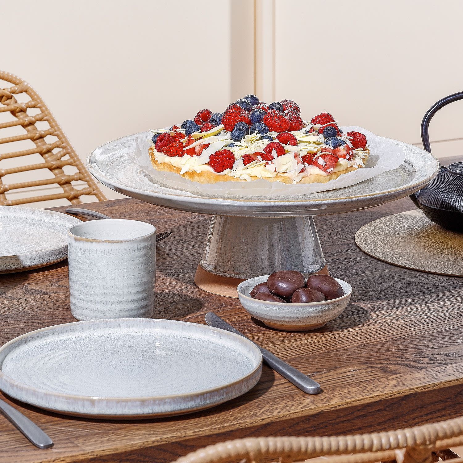 Het plateau is vervaardigd uit hoogwaardig stoneware en afgewerkt met een reactieve glazuurlaag, waardoor elk stuk een uniek karakter krijgt. De beigekleurige taartplateau brengt warmte en sfeer op tafel, ideaal voor feestelijke gelegenheden, familiebijeenkomsten of een gezellige high tea.
