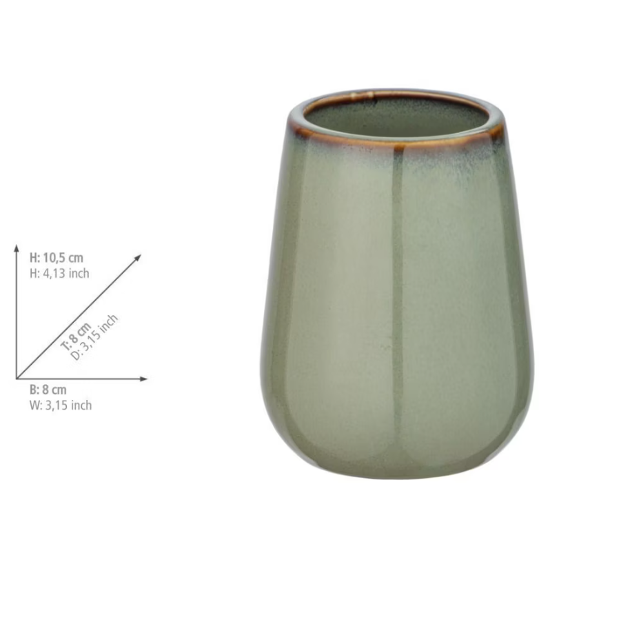 De beker is ideaal voor het opbergen van tandenborstels, tandpasta, scheermesjes of make-upkwasten, maar kan ook dienstdoen op uw bureau als stijlvolle houder voor pennen en potloden. Dankzij het compacte formaat (8 x 10,5 cm) past hij moeiteloos op de wastafelrand of plank.