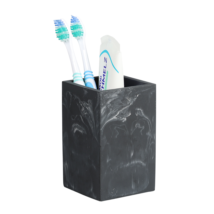 Deze tandenborstelbeker met zwarte steenlook combineert een moderne uitstraling met praktische functionaliteit. De zandmarmerstructuur zorgt voor een eigentijdse toevoeging aan de badkamer of het gastentoilet. Het compacte formaat maakt de beker geschikt voor plaatsing op kleinere wastafels of plankjes.