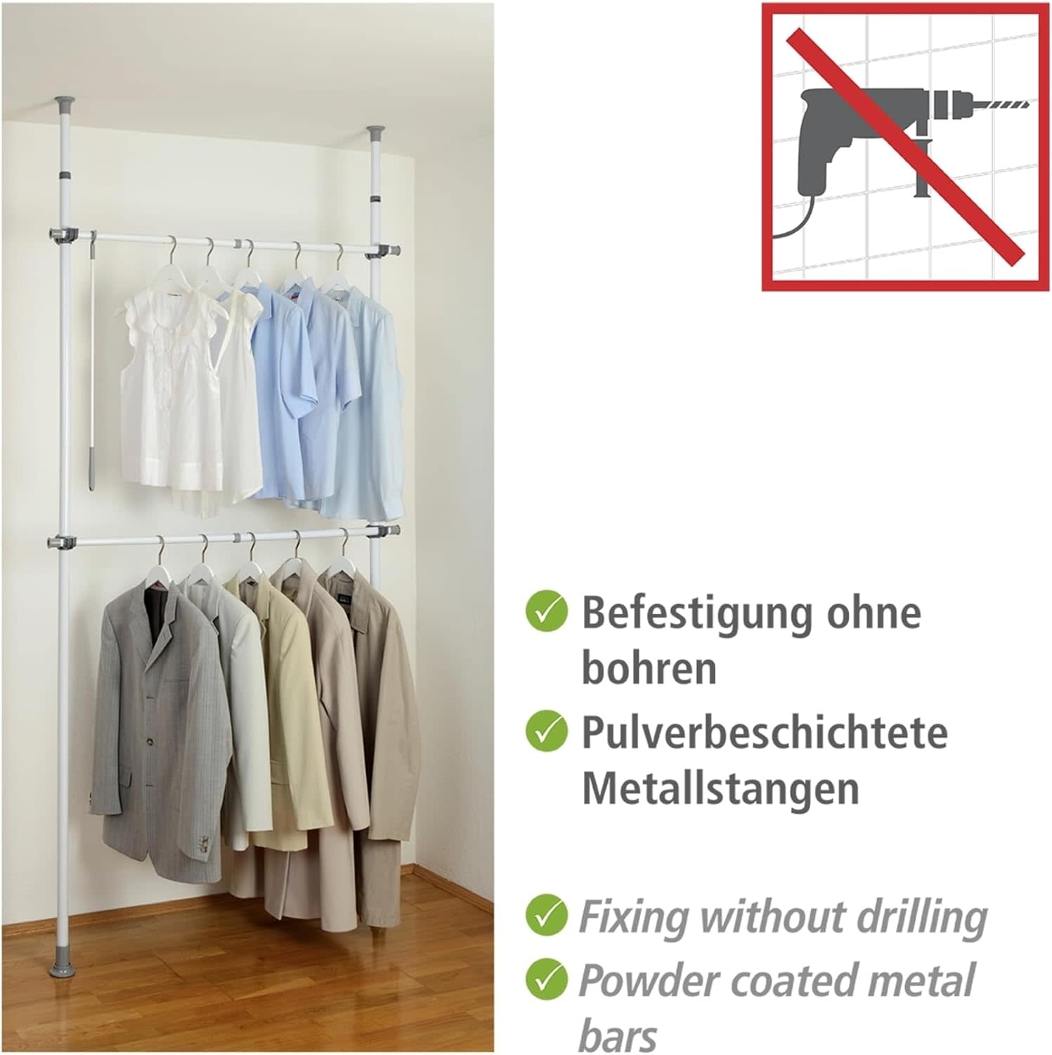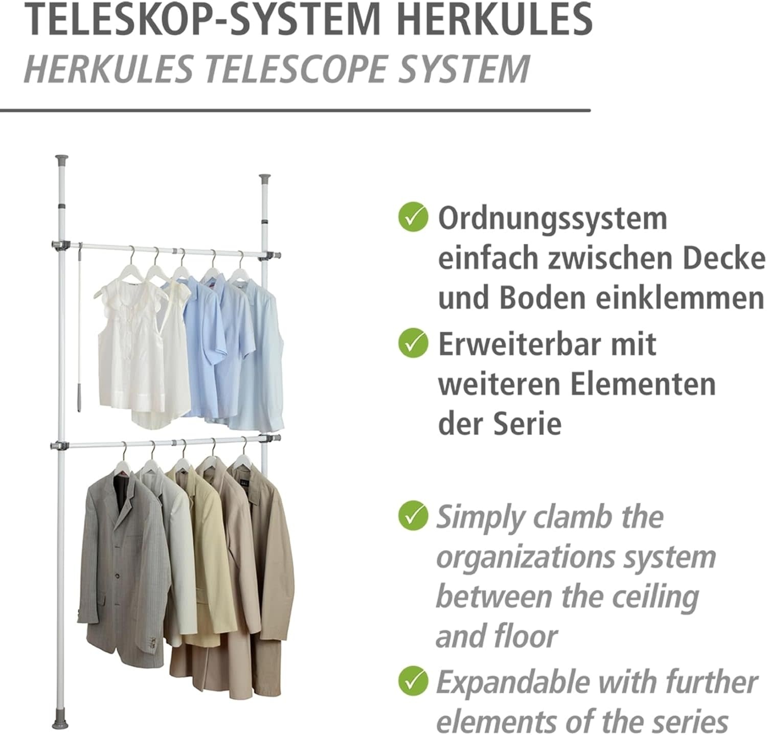 Het Herkules Basic telescopisch kledingrek combineert slimme functionaliteit met een modern, strak design en is ideaal voor iedere inloopkast, slaapkamer of garderoberuimte.