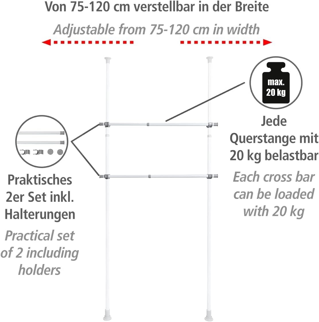 Optimaliseer je inloopkast, garderobe of slaapkamer met deze stevige en verstelbare kledingroede van het Hercules telescoopsysteem van WENKO. De horizontale stang van wit gepoedercoat staal is uitschuifbaar van 75 tot 120 cm en biedt voldoende ruimte voor kleding, handtassen of accessoires. Dankzij de meegeleverde kunststof beugels monteer je de kledingstang eenvoudig tussen de Hercules-hoofdpalen, zonder boren.