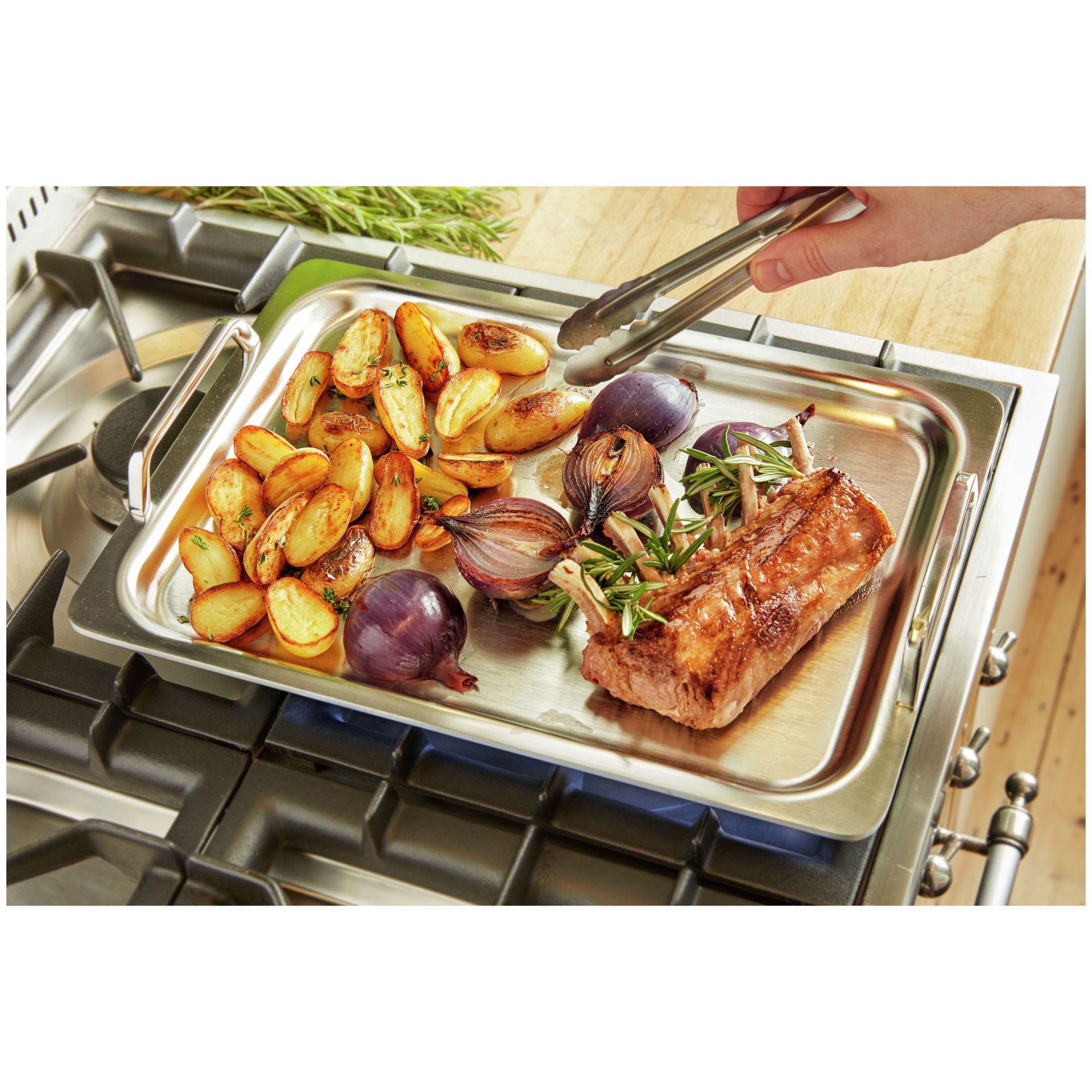 De gelaste grepen zijn stevig, hygiënisch en liggen comfortabel in de hand. Na gebruik maakt u de bakplaat eenvoudig schoon, dankzij de Silvinox® technologie behoudt het roestvrij staal zijn zilverwitte glans, zelfs na jarenlang intensief gebruik. Voor extra gemak deglaceert u de plaat direct na gebruik.
