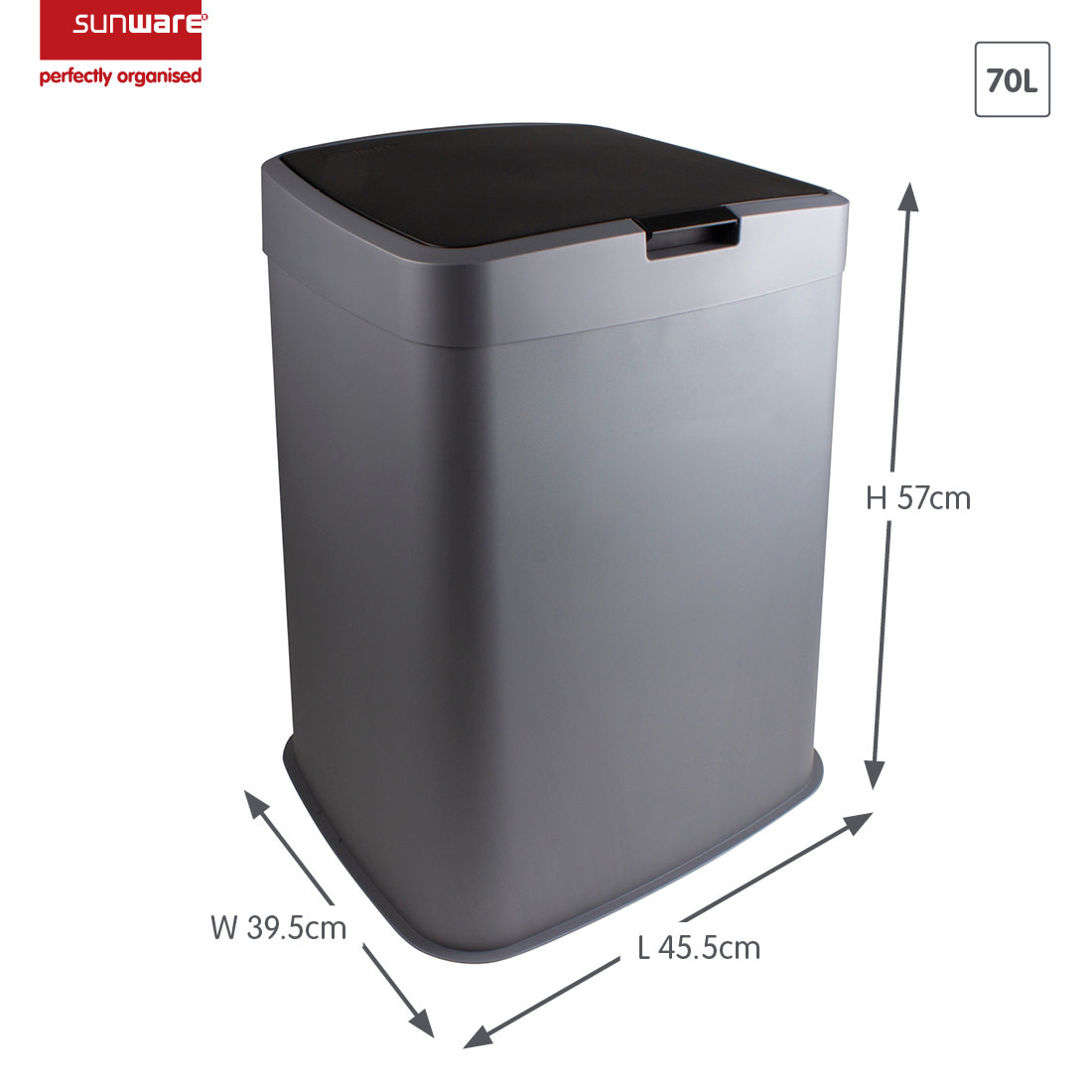 Deze vuilniszakhouder van Sunware uit de Delta serie is een praktische afvaloplossing voor buiten of in huis. Door het strakke ontwerp en de neutrale kleuren past hij goed buiten, maar ook in bijvoorbeeld de keuken, bijkeuken, garage of berging. De houder heeft een inhoud van 70 liter en biedt daarmee genoeg ruimte voor een grote vuilniszak.