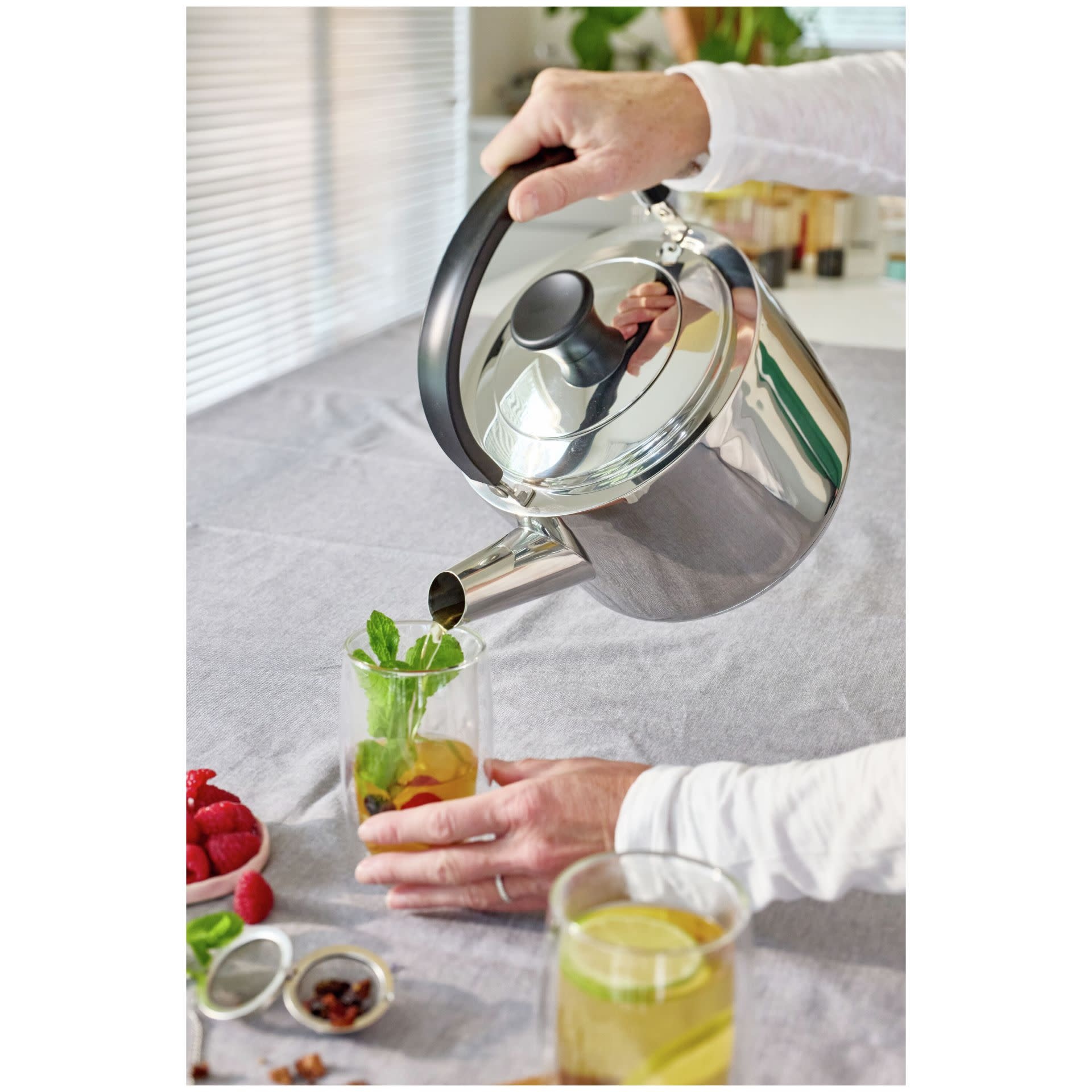Dankzij de speciale gietrand kun je water veilig en precies schenken zonder geknoei. De ketel is geschikt voor alle soorten warmtebronnen, inclusief inductie, en beschikt over een encapsulated bodem voor snelle en gelijkmatige warmtegeleiding. Ondanks het royale formaat ligt hij prettig in de hand en is hij eenvoudig te bedienen.