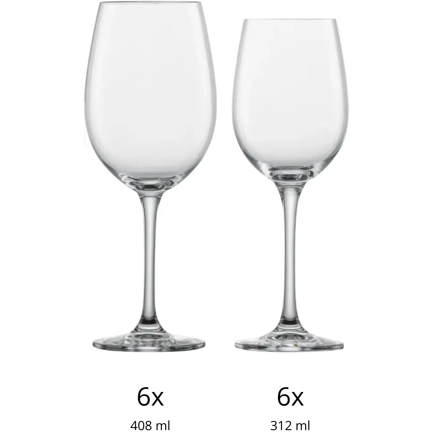 De rode wijnglazen hebben een inhoud van 408 ml en bieden voldoende ruimte voor de wijn om goed te ademen. Dit helpt om geur en smaak beter tot hun recht te laten komen, vooral bij lichtere en fruitige rode wijnen. De witte wijnglazen hebben een inhoud van 312 ml en zijn zo gevormd dat frisse aroma’s goed behouden blijven.