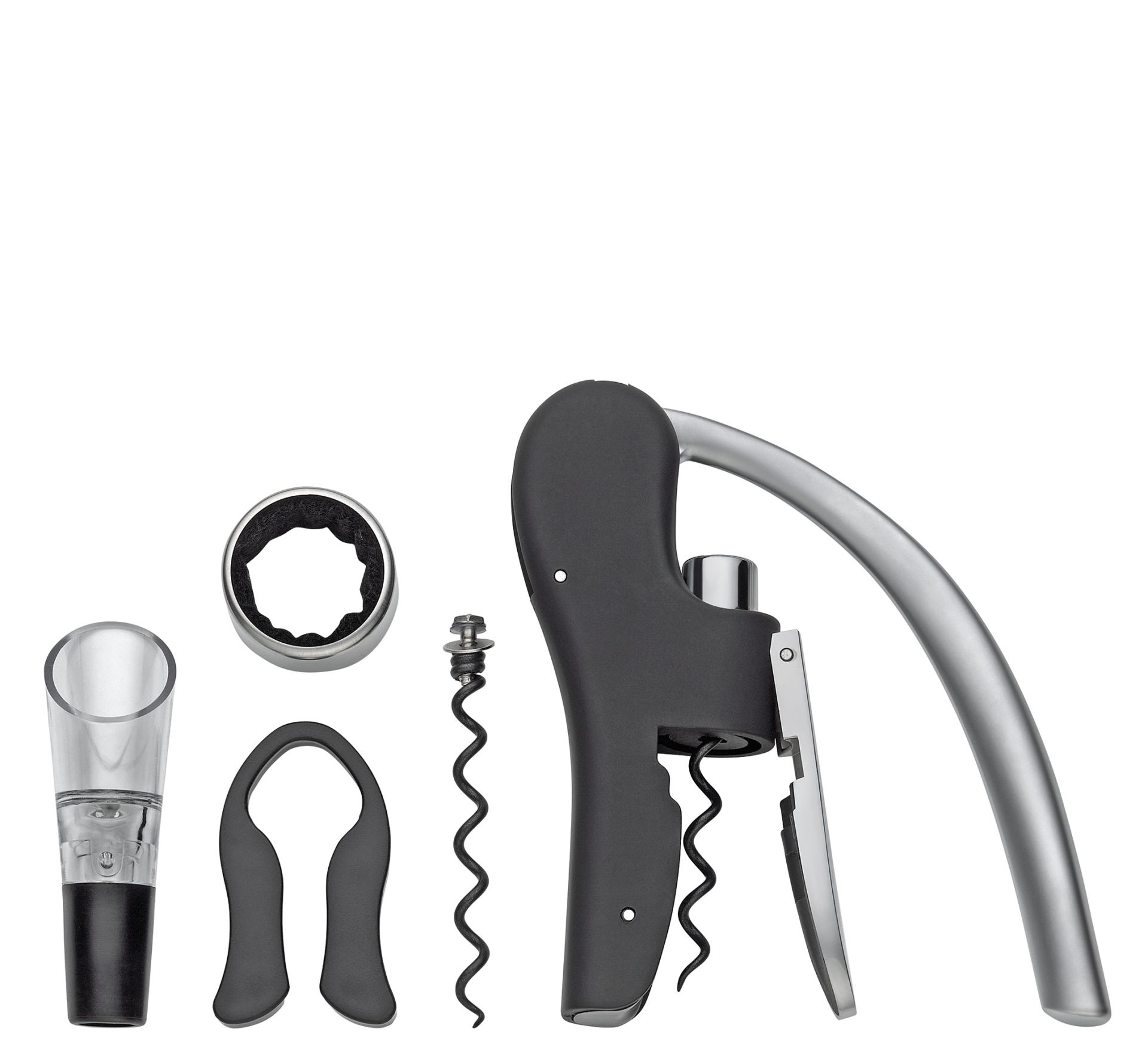 De kurkentrekker is robuust gebouwd en ligt dankzij de verlengde hendel prettig in de hand, zodat u zonder moeite elke fles opent. Voor extra gemak wordt een reservespiraal meegeleverd. De foliesnijder verwijdert de capsule snel en veilig, terwijl de schenktuit en de druppelvanger morsen voorkomen – ideaal wanneer u uw gasten een perfect glas inschenkt.