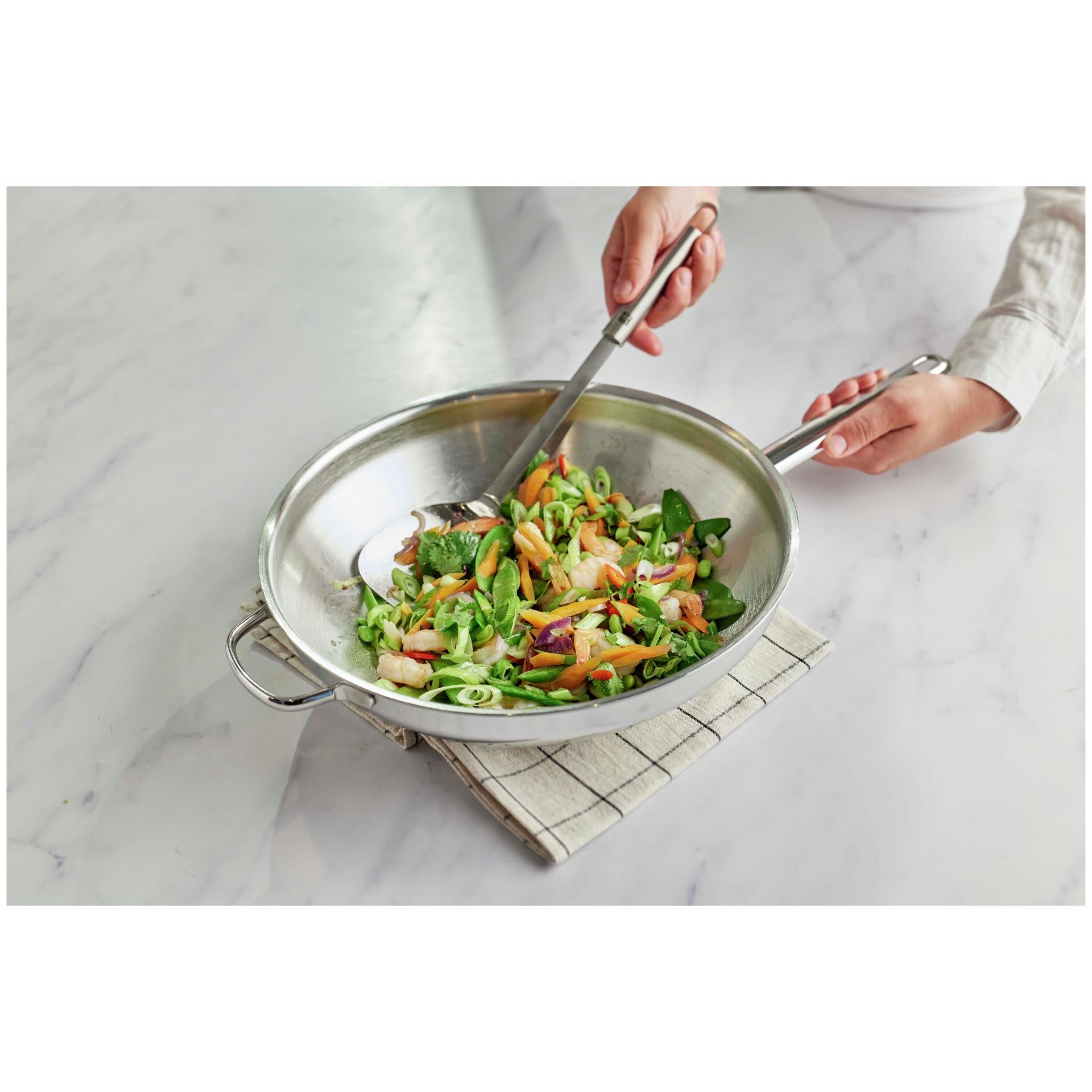 Deze roestvrijstalen wok van 32 cm diameter heeft een vlakke bodem, zodat hij goed blijft staan en werkt op elke kookplaat, inclusief inductie. De wok is gemaakt uit ons unieke 7-lagenmateriaal dat zorgt voor een optimale warmtespreiding tot aan de rand. Dankzij de TriplInduc technologie in het materiaal haal je op inductie zelfs tot 30% meer rendement!