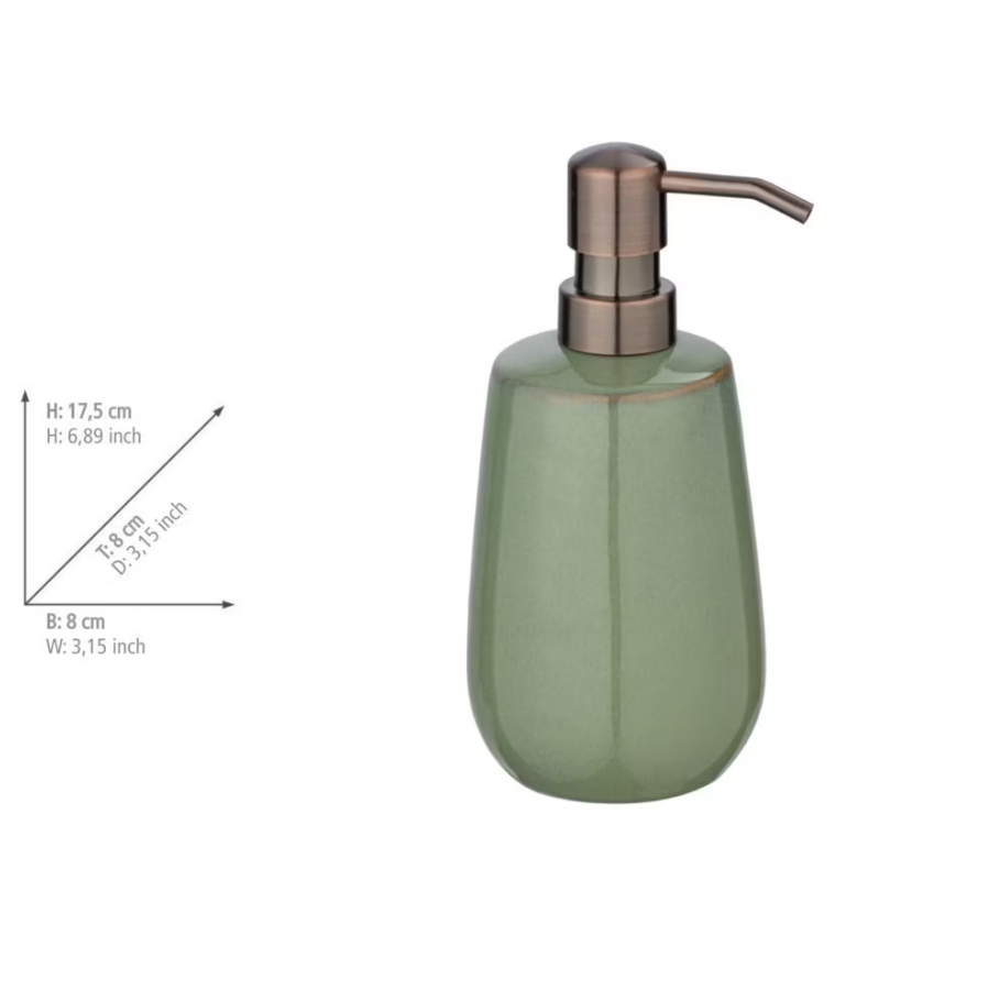 Breng stijl en harmonie in uw badkamer of keuken met de Sirmione zeepdispenser van Wenko. Deze hoogwaardige navulbare pompje combineert een natuurlijke groene kleur met verfijnde kopertinten, wat zorgt voor een rustgevende én elegante uitstraling.